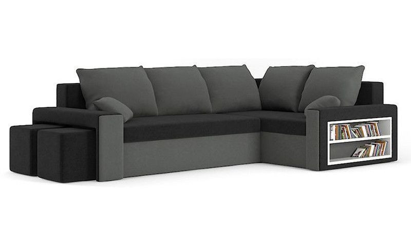 METRO kinyitható sarokkanapé polccal és 2 db puffal, normál szövet, hab töltőanyag, jobbos, bal oldali polc, jobb oldali puff tároló, fekete / szürke