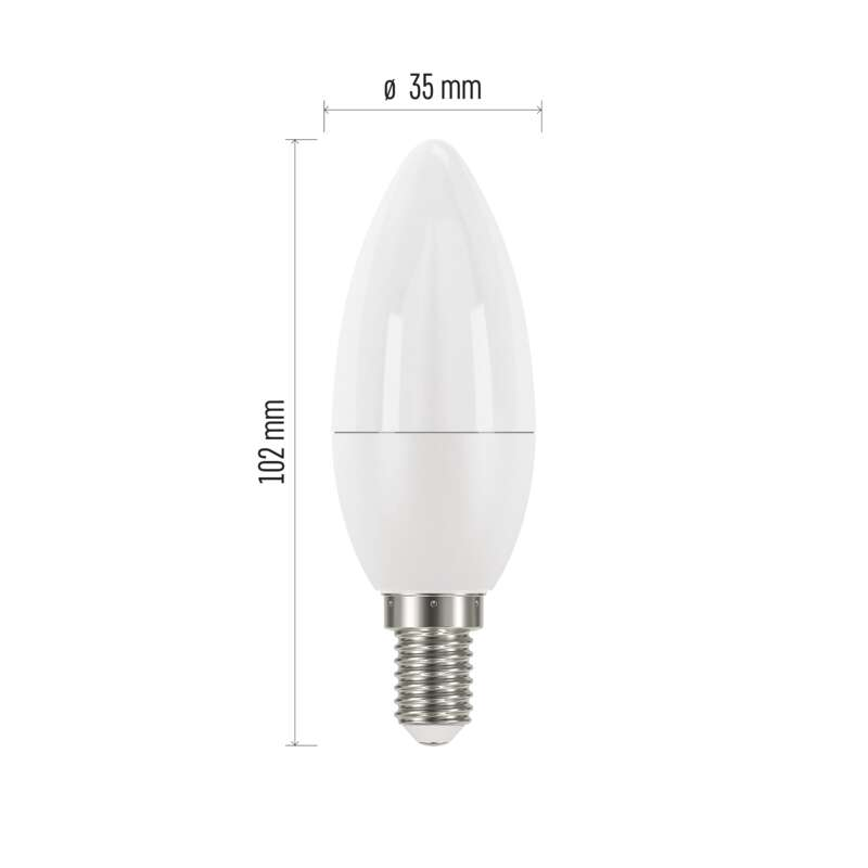 technológia: LED, foglalat: E14, fény színe: meleg fehér, helyettesítő: 40 W, forma: gyertya, fényáram: 470 lm, színhőmérséklet: 2 700 K, fogyasztás: 5 W, sorozat: CLASSIC, fényhasznosítás: 94 lm/W, energiaosztály (2021.9.1 -től): F, energiaosztály (2021.8.31 -ig): A+, sugárzási szög: 270°, élettartam: 30 000 óra, garancia-időszak: 3 év, teljesítménytényező: 0.51, kapcsolási ciklusok száma: 25 000, színvisszaadási index (CRI): Ra >80, chipek típusa: SMD, feszültség: 230 V~/50 Hz, méretek: 102 × 35 × 35 mm, értékesítési csomagolás: 3 db, doboz