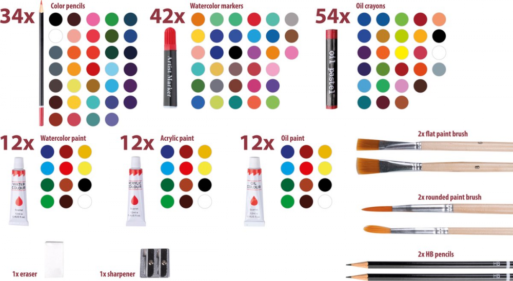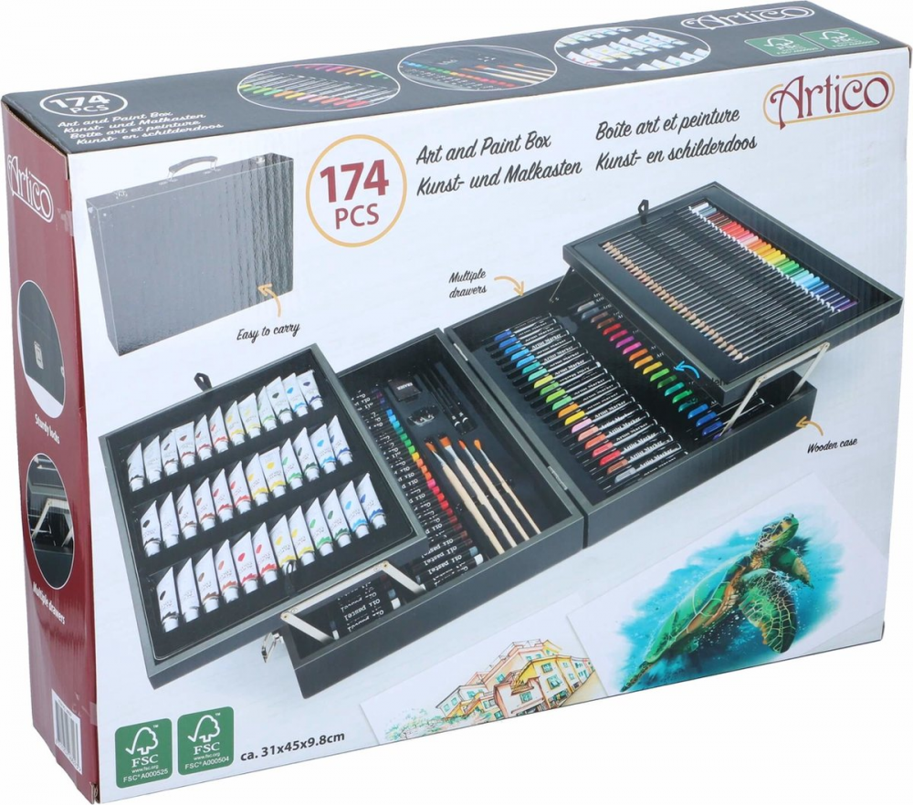 Szeretsz rajzolni és festeni? Az Artico 174 elemes készletével, teljesen átadhatod magad a kreativitásának. Ez a felnőtteknek készült készlet sokféle színező- és festőanyagot tartalmaz egy erős, fából készült tokban, beleértve színes ceruzákat, markereket, festéket és zsírkrétát. A színező és rajztáska különféle típusú ecseteket, 2 radírt, 1 ceruzahegyezőt és 2 festőpalettát is tartalmaz. A vázlatok elkészítésétől az utolsó, apró díszítésig biztosítja a minőségi és széleskörű készlet kínálatot