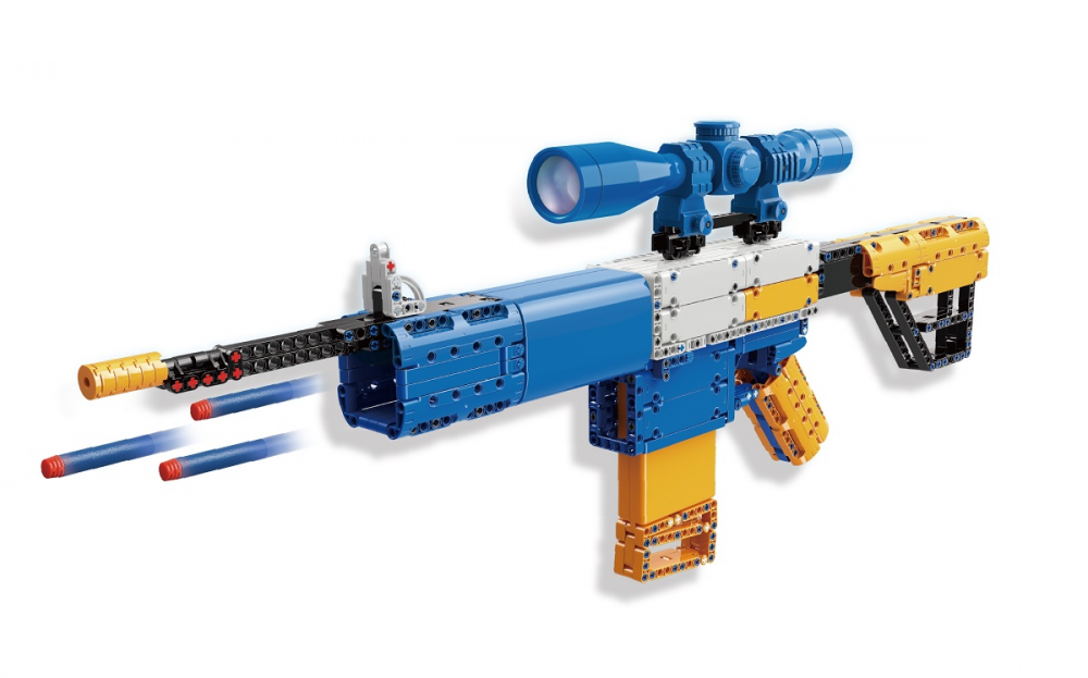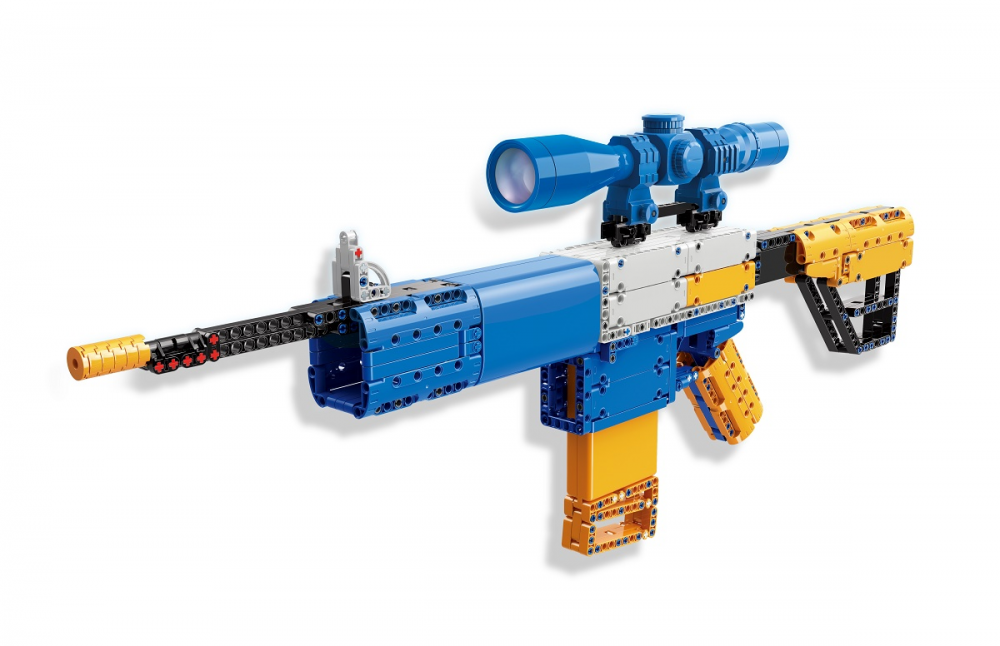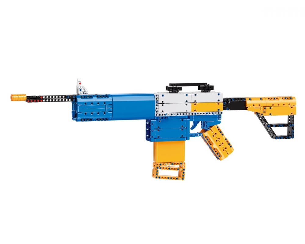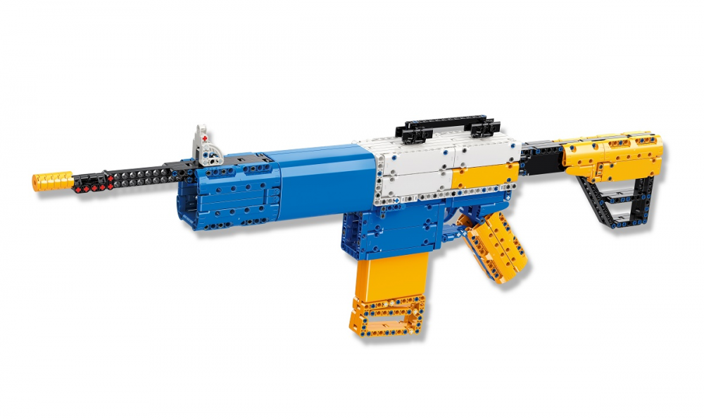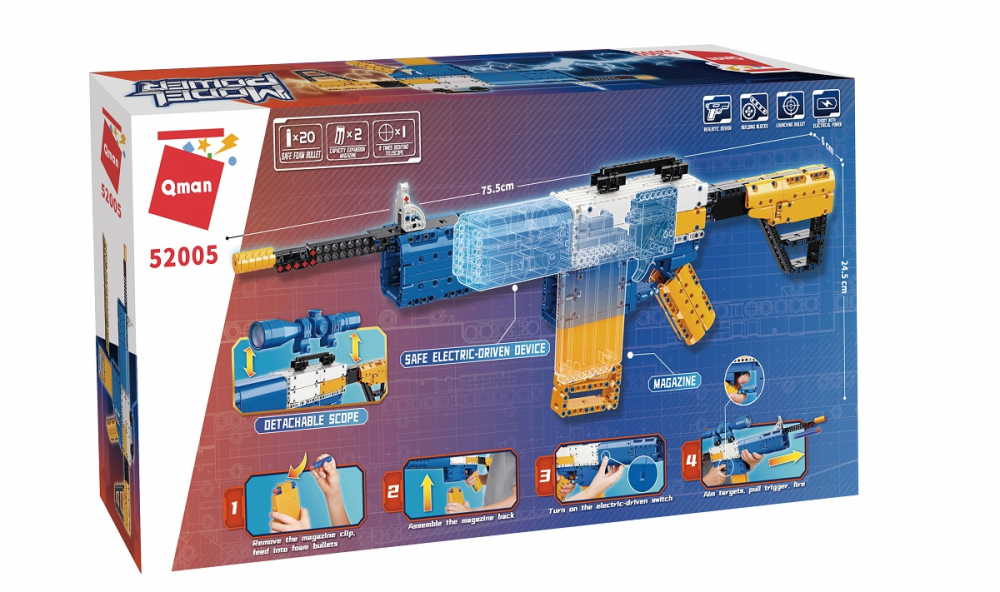 QMAN márkájú minőségi lego-technic-kompatibilis építőjáték. Szivacstöltények kilövésére is alkalmas, élethű 75,5 cm hosszú játék gépkarabély, elektromos hajtású újratöltéssel, két db tárral. 629 db építőelemből áll, 8 éves kortól ajánlott.