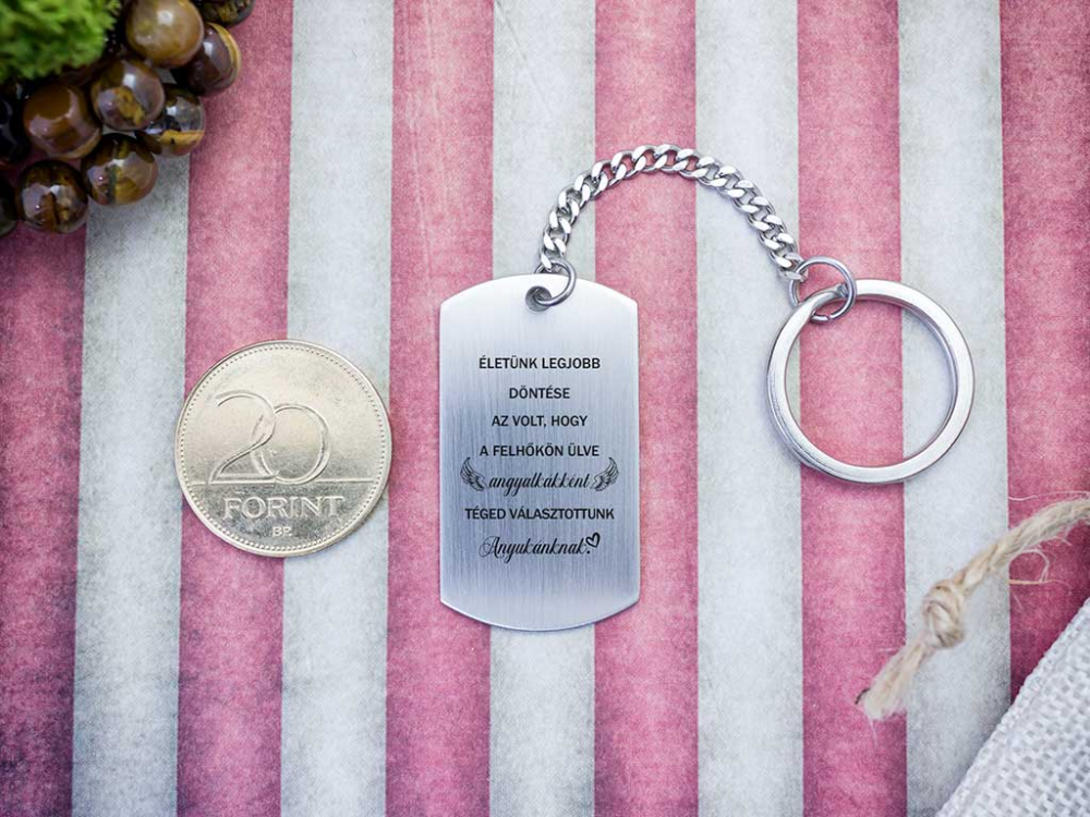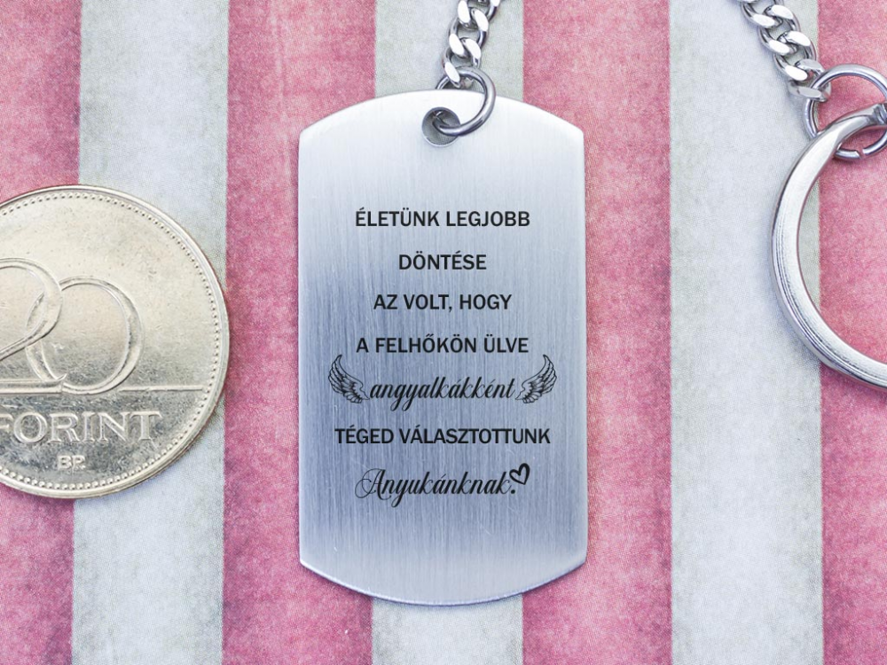 "Életünk legjobb döntése volt, hogy a felhőkön ülve angyalkákként téged választottunk Anyukánknak."\n\n feliratos acél téglalap medálos kulcstartó\n\n\n\n Számotokra állítottunk össze egy kedves meglepetést!\n\nSzabó Attila Pocakmese című művében oly kedvesen ír arról a pillanatról, amikor egy édesanya megérzi, hogy kiválasztotta őt az angyalkája: „Anya a parkban ült a padon, amikor megérezte, hogy beköltöztél a pocakjába. Ejha! – mondta tágra nyitott szemmel. Majd elpityeredett. Aztán elvigyorodott. (Pityergett vigyorogva, vigyorgott pityeregve.) És a kezét a hasára téve, karcsú ringással hazarepült. Olyan szép volt, és olyan boldog, hogy megfordultak utána még az útjelző táblák is.” Csodálatos pillanat anyának és gyermekének is, mint utána még számos az életben. Vigyázzátok és szeressétek egymást!\n\nEzt a nagyszerű ajándék ötletünket egy gravírozott acél medál, és egy acél kulcstartó alkotja.\n\nA kulcstartót egy téglalap alakú 42×24 mm méretű elegáns acél medál díszíti, amit lézer gravírozunk.\n\n\n\n Az acél medál nagyon strapabíró, nem kopik, nem színeződik el, rendkívül hosszú ideig megőrzi eredeti szépségét.\n\n\n\n\n